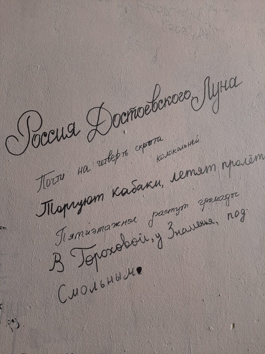 Приглашаем всех в 12.00, 14.00 и 16.00 на прогулки-экскурсии от арки дома № 53 по Литейному проспекту, где на стене проступают строки ахматовской элегии «Россия Достоевского…», до памятника Ф.М. Достоевскому у Кузнечного переулка. Литературовед Лев Лосев отмечал, что «писавшие об Ахматовой не раз приходили к заключению, что в ее творчестве проза возвращает долг поэзии, что ее стихи - это спрессованные до предела психологические новеллы, если не романы. В связи с этими рассуждениями всегда возникает имя Достоевского. Известно, что он был любимым писателем Ахматовой, что она знала Достоевского так же хорошо, как она знала Пушкина».
